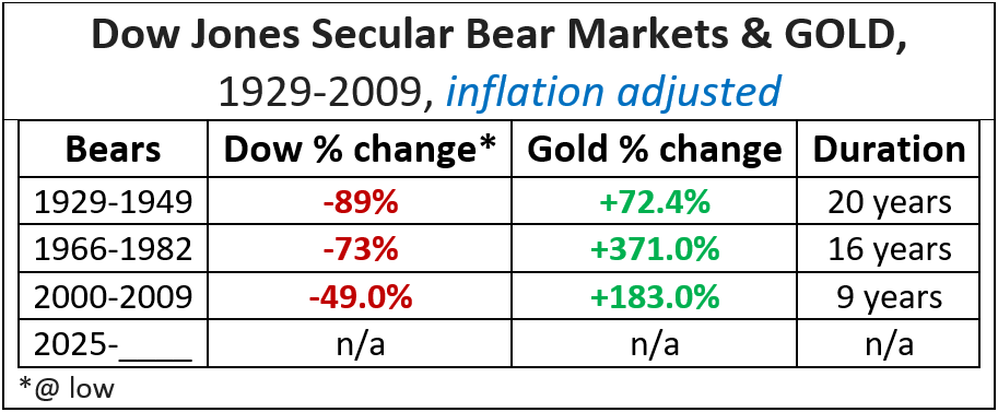 Based on my research findings in the table below gold is projected to continue to steadily climb to new highs. Its because the S&P and Dow Jones Industrials Composite entered secular bear markets in February 2025. The table below depicts that gold outperformed the Dow Jones composite index for all of the index’s secular bear markets since 1929 (see chart below table). Based on my research of all secular bears since 1871 gold is projected to continue to steadily climb to new all-time highs until at least 2034.
