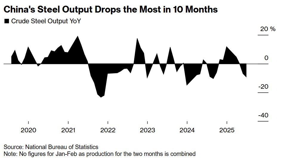 China’s steel output had its biggest drop in 10 months in June, falling 9.2% from the year before to 83.2 million tons. That left first-half production at its weakest since 2020.