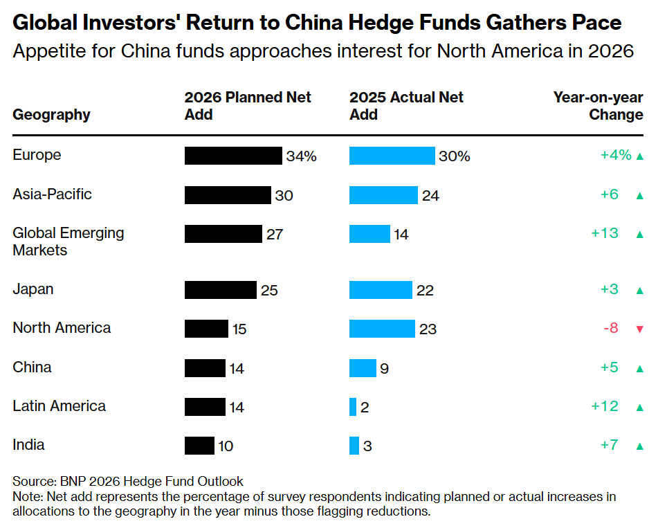 A net 14% of investors intend to channel more capital to China funds in 2026, BNP found, with about 9% of them already having done so last year. Amid a broader shift away from US assets, the survey showed that appetite for exposure to the world’s second-largest economy this year is only slightly lower than interest in North America, which has fallen significantly from 2025. That reinforces a revival from 2023, when 42% of allocators pulled capital from China funds.