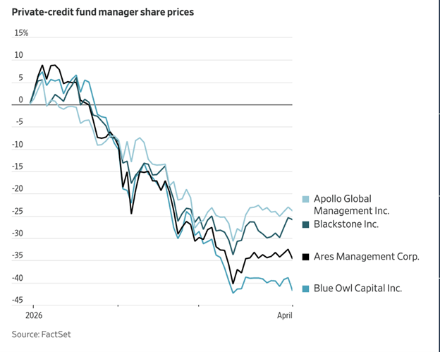 Companies in the private credit space have tanked as redemption requests have soared. (Source: FactSet)