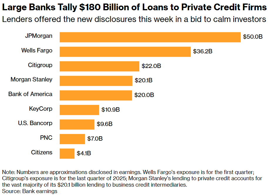 Wells Fargo & Co. said it had about $36.2 billion of loans to private credit funds in the first quarter, while Citigroup Inc. reported $22 billion of such exposure in the fourth quarter, noting that it has had zero losses over the life of the portfolio.