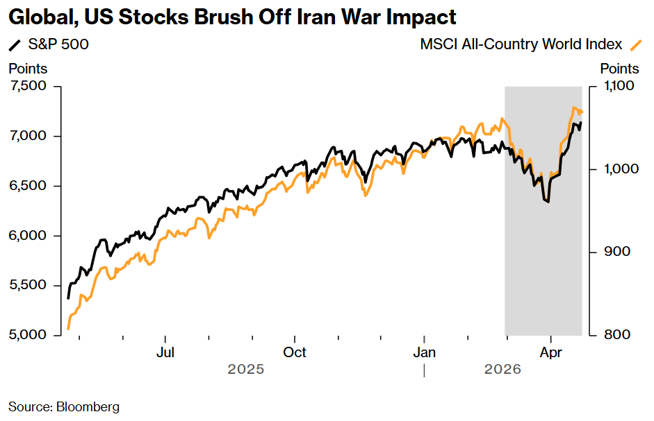 Almost two months into the conflict in Iran, global stock markets are staging a defiant rally. From the US to Taiwan and South Korea, a disconnect has emerged: While tensions remain high, equities are charging back toward all-time highs.