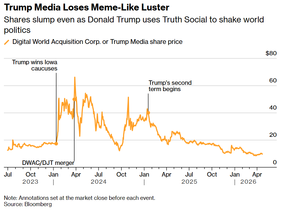 The decline in shares of Trump Media & Technology Group from their 2022 peak. CEO Devin Nunes has left the company.
