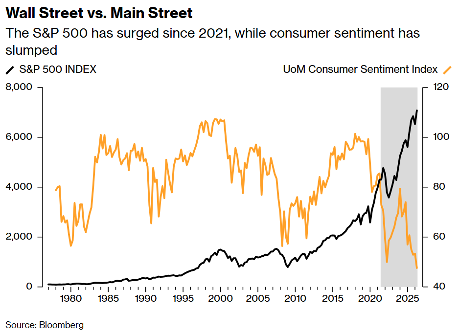 Consumer sentiment this month sank to an all-time low, with Americans increasingly worried about mounting inflation driven by the war. The divide has reached a critical juncture where investors need to question how much further sentiment can worsen before it starts to erode the S&P 500 Index’s earnings power.
